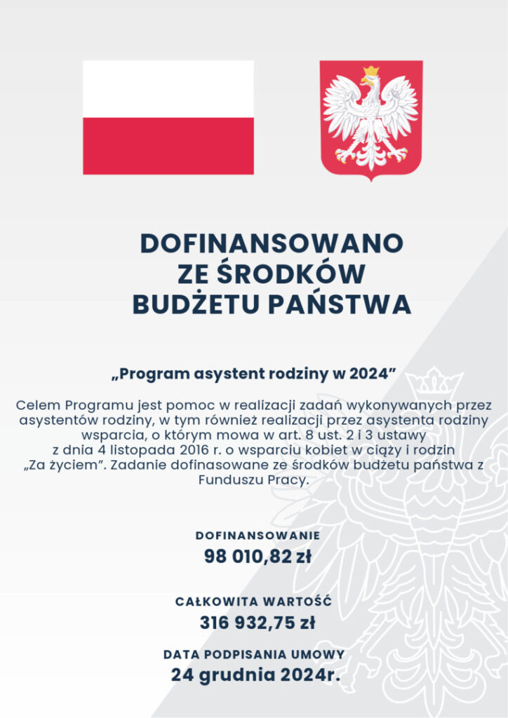 Opis zadania: Celem Programu jest pomoc w realizacji zadań wykonywanych przez asystentów rodziny, w tym również realizacji przez asystenta rodziny wsparcia, o którym mowa w art. 8 ust. 2 i 3 ustawy z dnia 4 listopada 2016 r. o wsparciu kobiet w ciąży i rodzin „Za życiem”. Umowa zakłada dofinansowanie dodatku do wynagrodzenia asystenta rodziny w wysokości do 2.400,00 zł brutto oraz kosztów zatrudnienia asystentów rodziny – w wysokości nieprzekraczającej 30% kosztów poniesionych przez gminę (wynagrodzenie wraz z pochodnymi od wynagrodzeń).