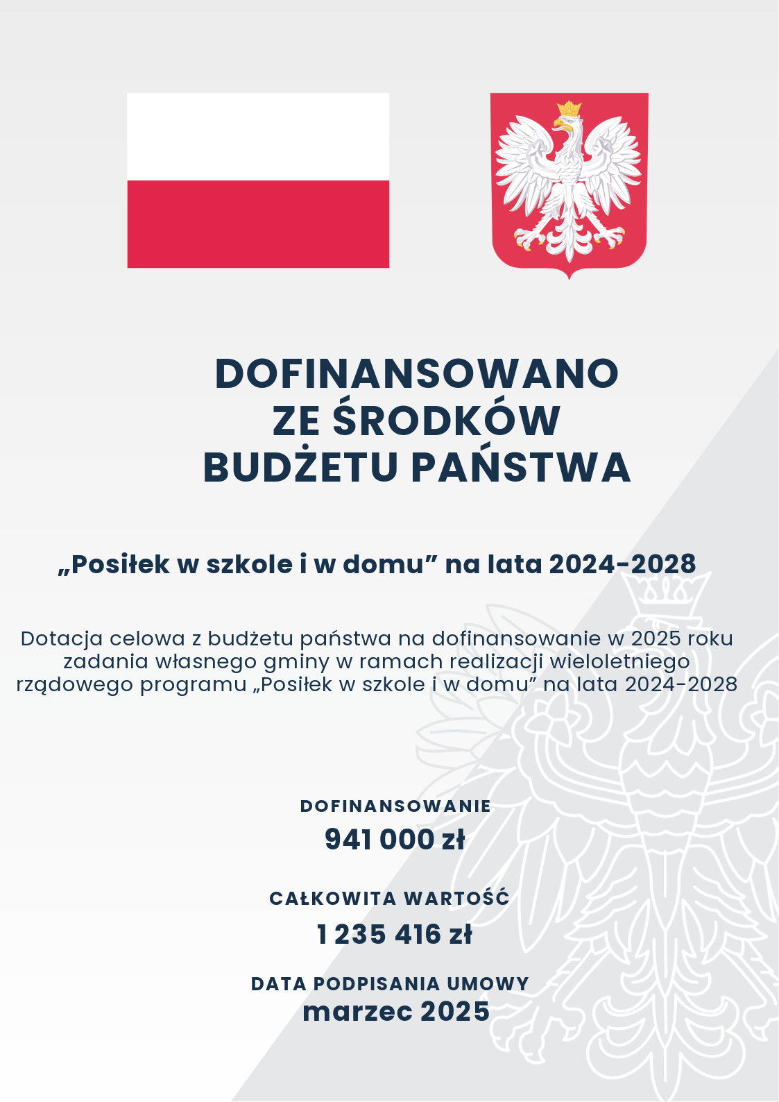 Środki dotacji celowej z budżetu państwa – “Posiłek w szkole i w domu” na lata 2024 – 2028 przeznaczone są na dofinansowanie działań Gminy polegających na zapewnieniu pomocy w formie posiłku, świadczenia rzeczowego w postaci produktów żywnościowych lub świadczenia pieniężnego na zakup posiłku lub żywności wszystkim osobom jej potrzebującym