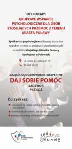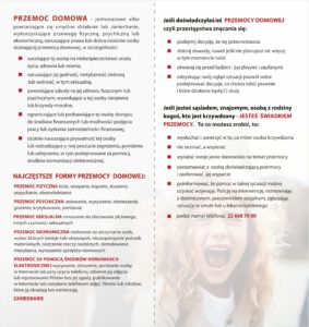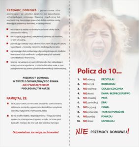Za pośrednictwem różnych instytucji rozpowszechniane są ulotki informacyjno-edukacyjne zawierające informacje na temat zjawiska przemocy oraz możliwości uzyskania wsparcia i pomocy dla osób uwikłanych w przemoc.