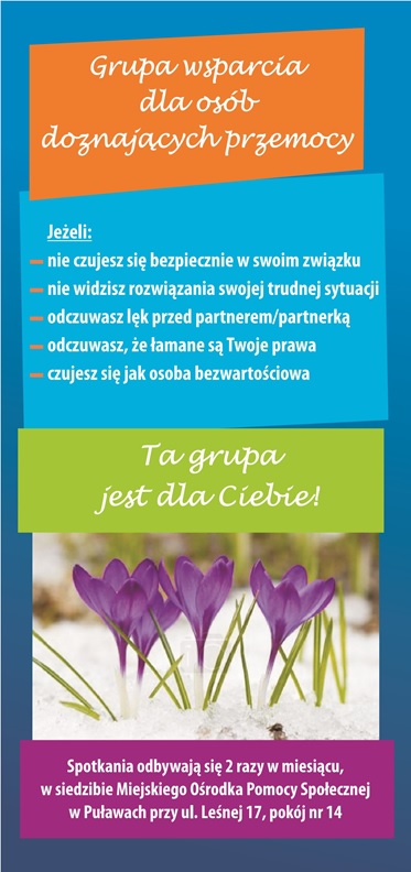 Zapraszamy wszystkie zainteresowane osoby do udziału w spotkaniach „Grupy wsparcia dla osób doznających przemocy”. Odbywają się one 2 razy w miesiącu (w czwartki o godz. 9.00) w siedzibie Specjalistycznego Ośrodka Wsparcia w Puławach przy ul. Kołłątaja 64.