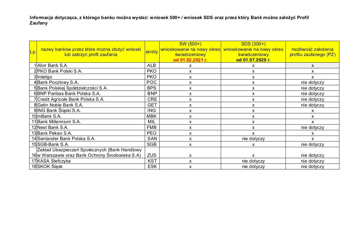 Informacja dotycząca, z którego banku można wysłać: wniosek 500+ / wniosek SDS oraz przez który Bank można założyć Profil Zaufany
