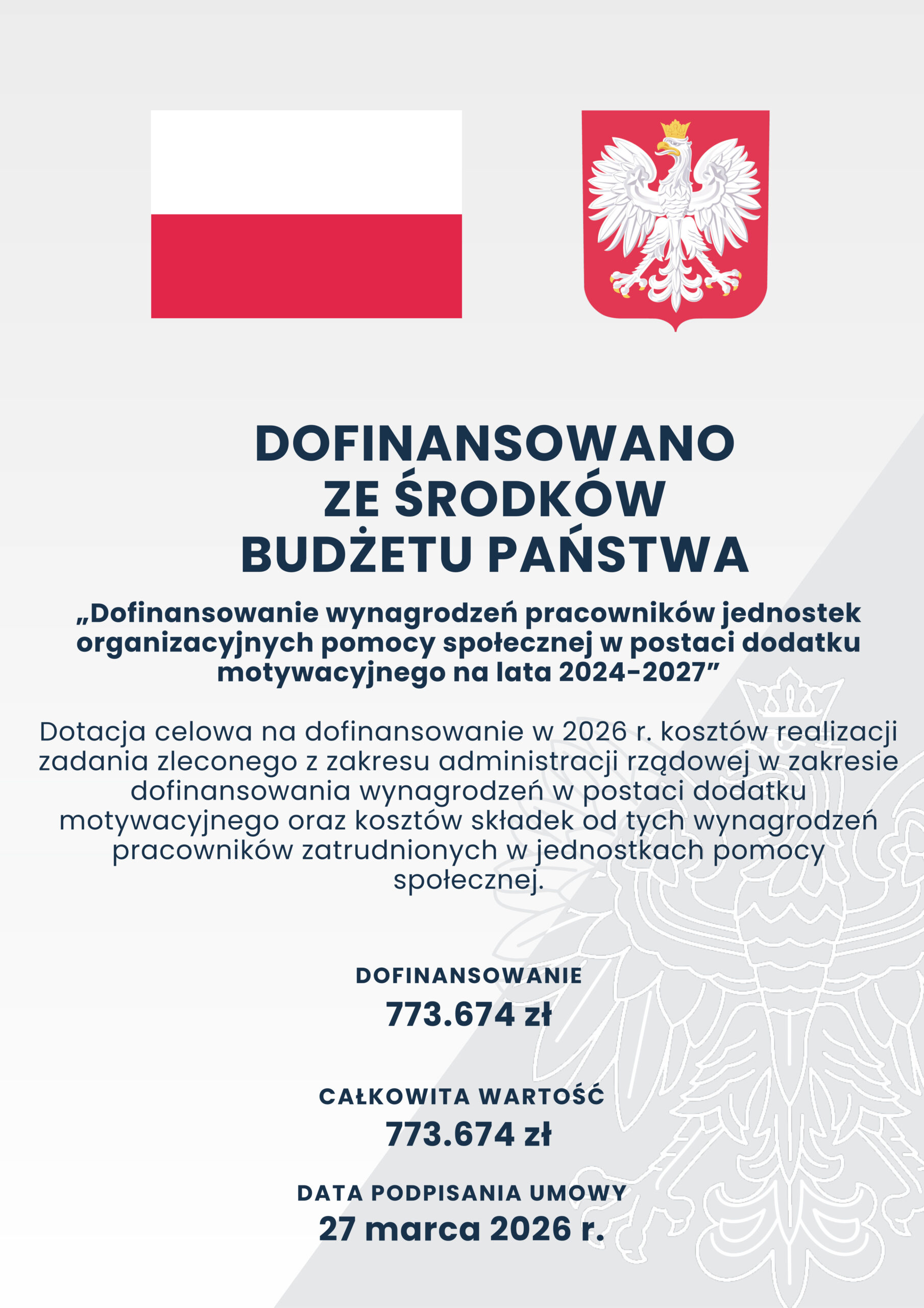 Nazwa zadania: Udzielenie dotacji celowej z budżetu państwa Gminie w 2026 r. na „Dofinansowanie wynagrodzeń pracowników jednostek organizacyjnych pomocy społecznej w postaci dodatku motywacyjnego na lata 2024-2027”.