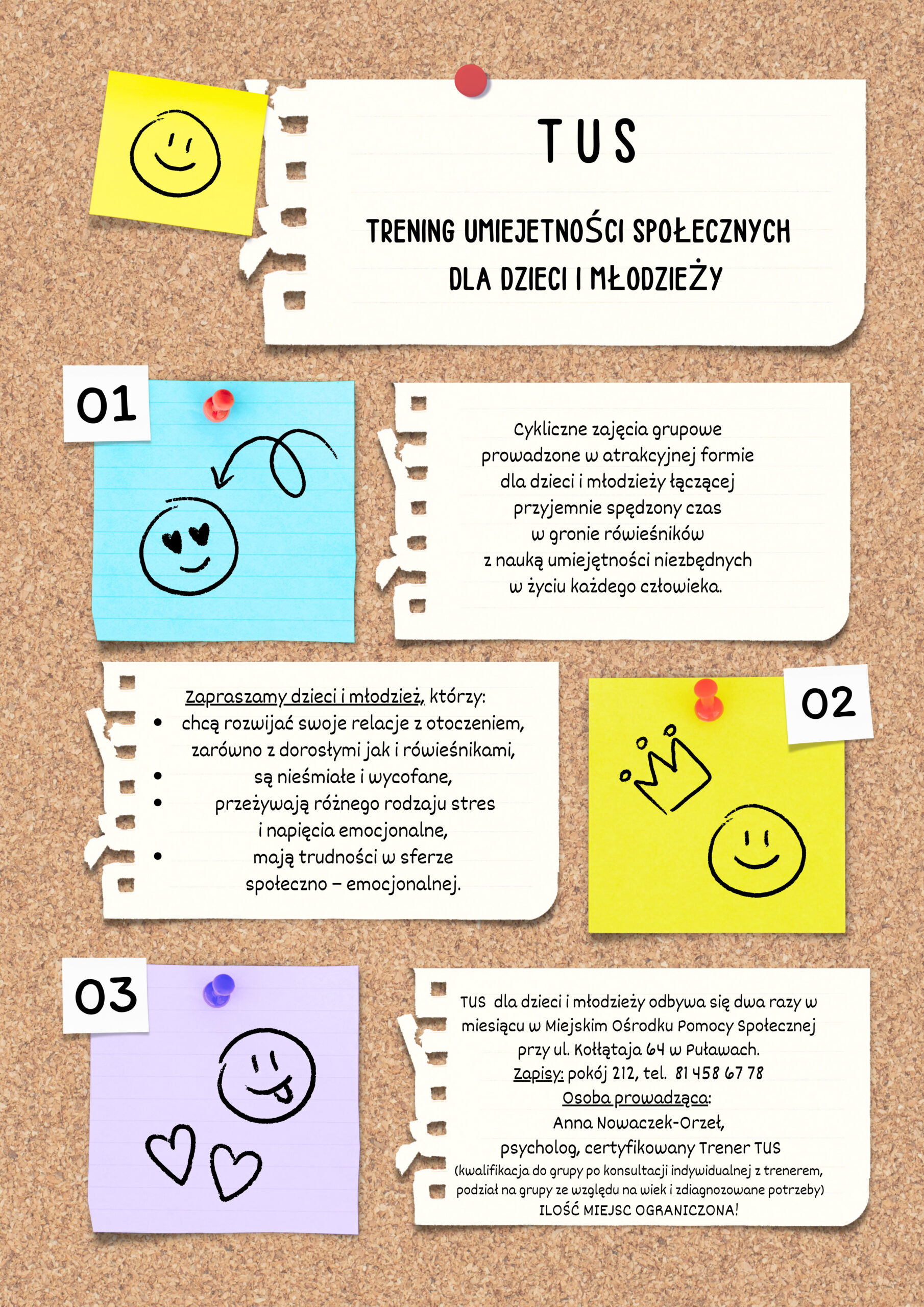 Zapraszamy na zajęcia grupowe dla dzieci i młodzieży w ramach „Treningu Umiejętności Społecznych”. Pierwsze spotkanie organizacyjne odbędzie się już 18.09 2024 r. (środa) o godzinie 16.00 w budynku Specjalistycznego Ośrodka Wsparcia przy ulicy Kołłątaja 64, pok. 207. Zajęcia prowadzi psycholog MOPS, trener TUS – P. Anna Nowaczek – Orzeł.