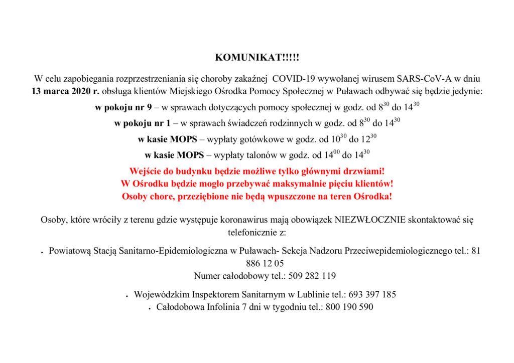 WAŻNA INFORMACJA – WIRUS SARS-CoV-A